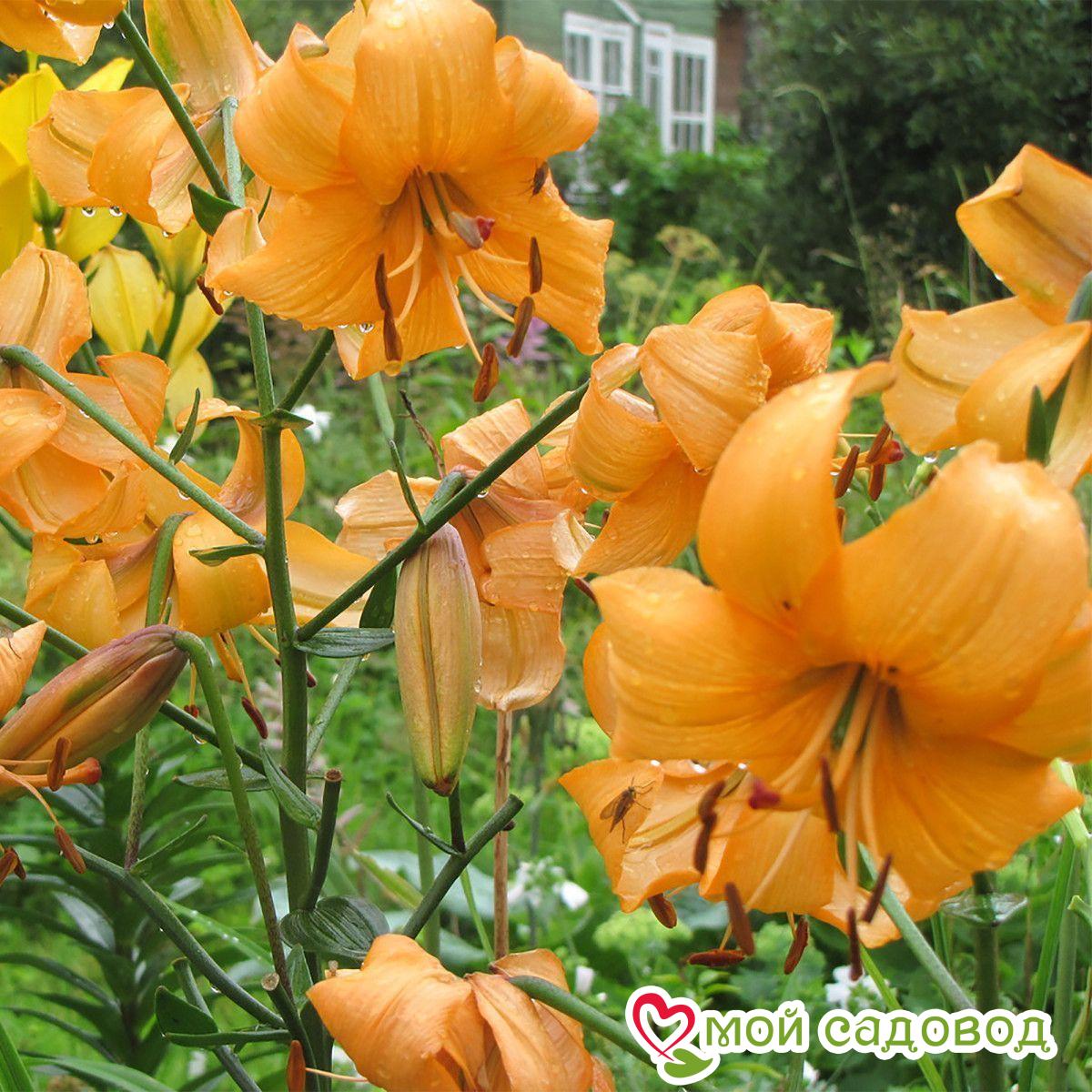 Лилия Pearl Stacey (Перл Стейси). Цветок оранжевый, поникающий, чалмовидный. Большое количество цветков на одном стебле, длительное цветение. Высота: 110 см. Новое направление в истории тигровых лилий — сложный тетраплоидный гибрид из серии «Жемчужина». Зимует без укрытия, очень неприхотлива. Азиатские гибриды — наиболее приспособленные к условиям Средней полосы России лилии. Сорта этой группы имеют наибольшее разнообразие по окраске, строению цветков, по высоте и срокам цветения. У них, за исключением единичных сортов, отсутствует аромат. Ассортимент этой группы очень обширен. Посадка лилии: Глубина посадки лилии зависит от почвы. Если почва легкая – можно углубить на 12-13 см, что составляет 3-4 диаметра луковицы. Если же почва глинистая или тяжелая, достаточно двух диаметров, глубина лунки не более 5 см. В выкопанную ямку насыпьте слой песка, установите луковицу донышком на песок, присыпьте сверху остатками грунта, сверху замульчируйте. Уход за лилией: Пышных бутонов у лилий можно добиться, соблюдая обычные правила ухода: в первый год лилиям не нужна весенняя подкормка, удобрения вносятся разово за сезон, после цветения. Но это лишь в том случае, если перед посадкой вносилось удобрение. Перед началом цветения высокорослые сорта рекомендуется подвязать. После цветения засохшие бутоны удаляют. Полив умеренный: лучше не долить, чем перелить. Если цветок начал чахнуть и имеются подозрения на перелив – смешайте по столовой ложке речного песка и древесной золы, высыпьте под цветок и не поливайте ближайшую неделю. Полив лилии важно проводить под корень, старайтесь исключить попадание воды на листья, это провоцирует ожоги на солнце и распространение грибковых заболеваний.